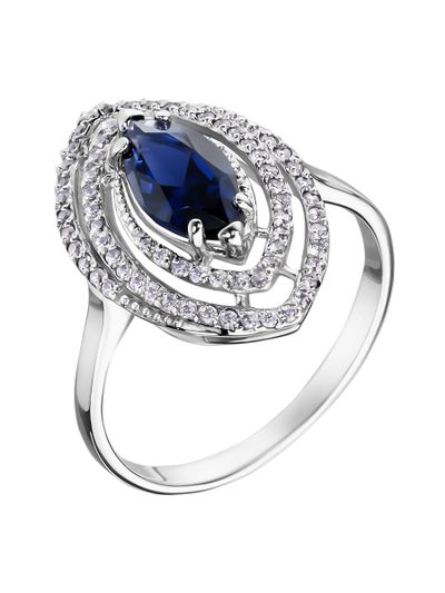Это кольцо из белого золота с сапфиром и бриллиантами. Эффектный центральный сапфир формы огранки "Маркиз" (он же "лодочка") окружен тремя рядами бесцветных мелких бриллиантов.