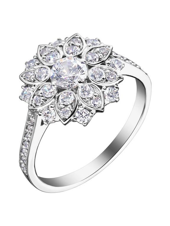 Это кольцо выполнено в виде ромашки с бриллиантами. В центре расположился крупный бриллиант, восемь лепестков вокруг украшены каждый двумя камнями. Пространство между лепестками и боковые части кольца искуссно инкрустированы бриллиантами. В результате все кольцо играет тысячью разноцветных искр.