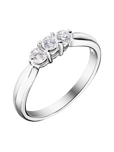 Это классическое кольцо с тремя бриллиантами. Центральный приподнят над двумя боковыми. Все три бриллианта образуют единую сверкающую поверхность и завораживают своей безупречной игрой.
