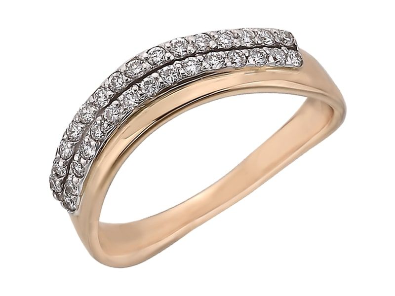 Золотое кольцо дорожка из двух рядов мелких белых бриллиантов. Кольцо выполнено в розовом золоте, дорожки покрыты белоснежным родием.