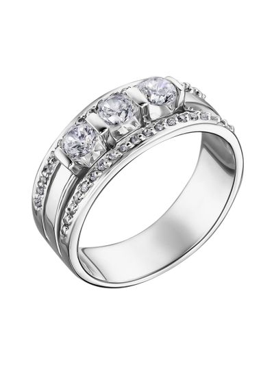 Это кольцо с тремя бриллиантами и россыпью. В кольце удачно использована рельсовая закрепка, обеспечивающая надежность, удобство в ношении и доступ света к камням. По бокам этого эффектного широкого кольца расположились две дорожки небольших бриллиантов.