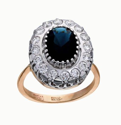 Это украшение создано по мотивам известного помолвочного кольца принцессы Дианы, перешедшего впоследствии герцогине Кейт Миддлтон. Центральный овальный сапфир насыщенного синего цвета в окружении бесцветных бриллиантов – пример классического ювелирного дизайна.