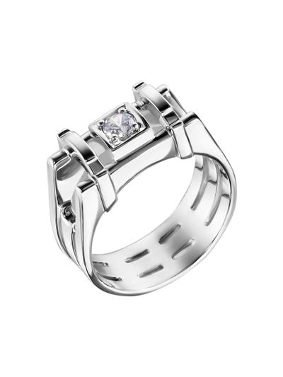 Это необычная мужская печатка изготовлена в современном стиле техно. Крупный центральный бриллиант, строгие и брутальные формы подчеркнут сильный характер своего обладателя. Печатка может быть изготовлена из золота любого цвета, а также может сочетать в себе разные цвета металла.