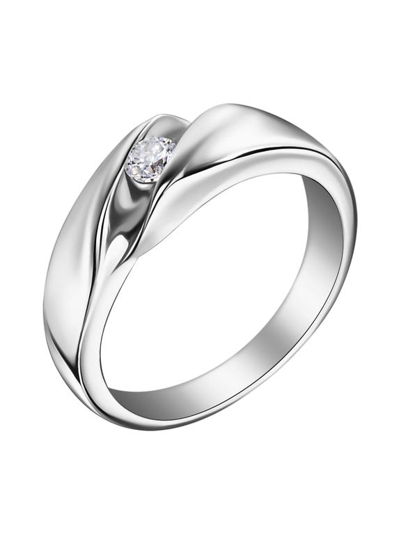 Это гладкое обручальное кольцо с одним бриллиантом. Бриллиант искусно закреплен между двумя бортами, такая закрепка называется «рельсовая». Камень вывешен и доступен для света и обозрения, а зеркало белого золота снизу усиливает эффект его игры. При всей открытости бриллианта, камень надёжно защищён бортиками и никогда не будет цепляться при повседневной носке. Иногда это является важным фактором для выбора обручального кольца для женщин таких профессий, как врачи, парикмахеры, косметологи, повара.