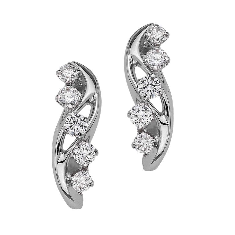 Это серьги дорожка из белого золота. Дорожка из пяти бесцветных бриллиантов «игриво» разместились на ажурном основании серьги из белого золота. Серьги удачно сочетают в себе строгость и легкомысленность.