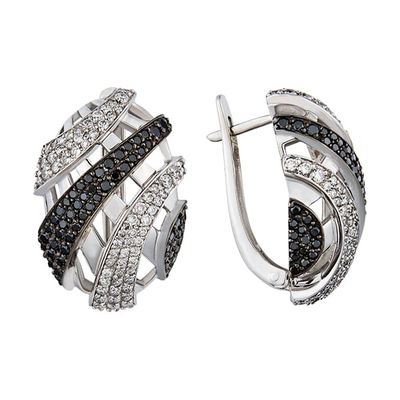 Это серьги из белого золота с чёрными бриллиантами. Пластины из белого золота формируют «воздушную» полусферическую конструкцию, рассекаемую тремя изогнутыми накладками, искусно инкрустированными россыпью белых и чёрных бриллиантов.