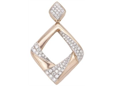 Эта золотая подвеска с бриллиантами выполнена в форме двух ромбов, между которыми предусмотрено подвижное соединение. Обе части украшены россыпью мелких бесцветных бриллиантов.