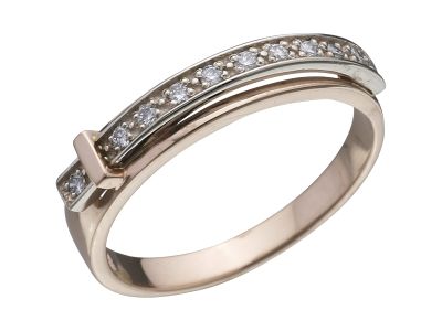 Это золотое кольцо в виде ремешка. Накладка-ремешок из белого золота искусно украшена белыми бриллиантами и прихвачена пряжкой из розового золота.