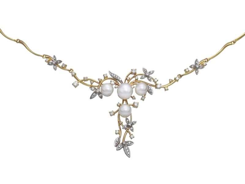 Это гибкое золотое колье с жемчугом. Четыре крупные морские жемчужины украшают белым перламутром золотые веточки с нежными цветочками из белого золота с бесцветными бриллиантами.